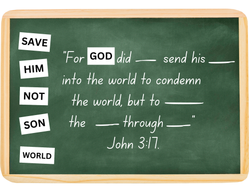 This activity idea can be used to introduce any new Bible memory verse or for reviewing older ones. John 3:17 is featured here and coordinates well with our John 3:16 lessons.