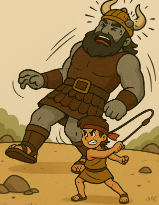* Alternate method: Copy the Goliath image onto an overhead projector sheet. Stack three to four large boxes on top of one another. Project the image onto the sides of the boxes. Trace the image and color it in using paint and/or markers. Establish a throw line a distance away from the stacked boxes. Players take turns throwing 5 beanbags at Goliath, attempting to knock him down.